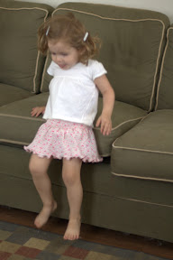 Here’s an action shot from this morning – she loves it. Sorry it’s blurry – I couldn’t get her to stand still! I think the length will work for the summer and I’ll make some pink leggings for the fall when it’s too short.
