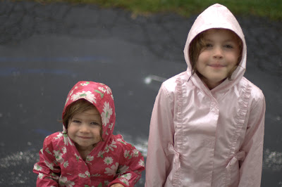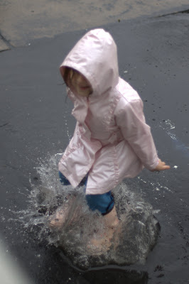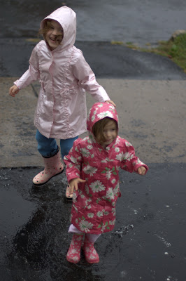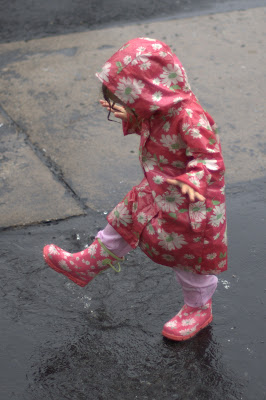 It rained a good part of the day yesterday and the kids were full of pent-up energy (donuts for breakfast anyone?) so I bundled them into play clothes, raincoats and boots, and took them outside for some puddle jumping. They had an absolute blast.